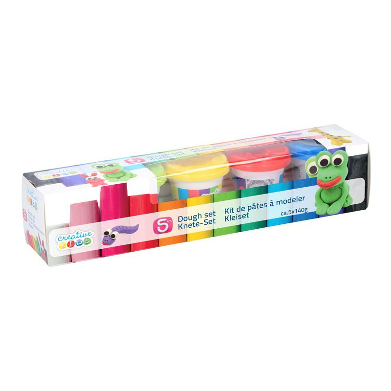 Le set contient 5 couleurs de pâte à modeler dans des récipients dont les couvercles sont munis de moules pour le pressage.