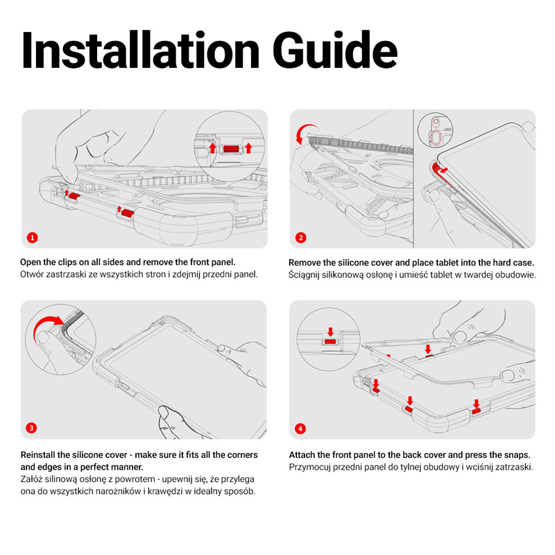 The Crong case uses a simple 4-step installation system based on three elements: a hard polycarbonate shell, a silicone cover, and a front panel. The snap-lock system ensures quick installation and a perfect fit for the device.