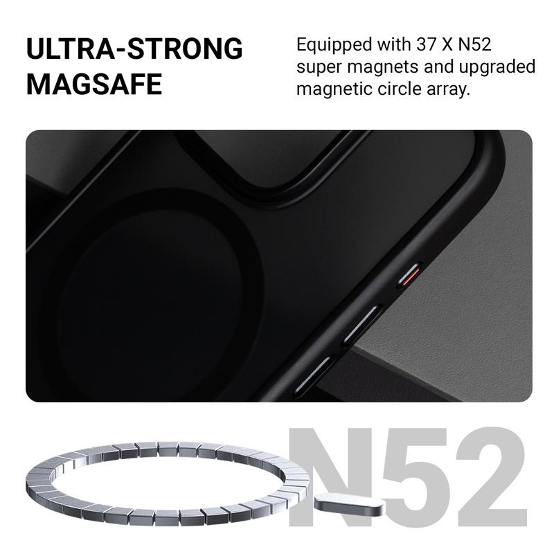 The Hybrid Frost MAG Cover is equipped with 37 high-power N52 magnets for faster wireless charging and seamless connection and disconnection of iPhone accessories. This CRONG case works with all MagSafe chargers, car mounts, power banks, and wallets.