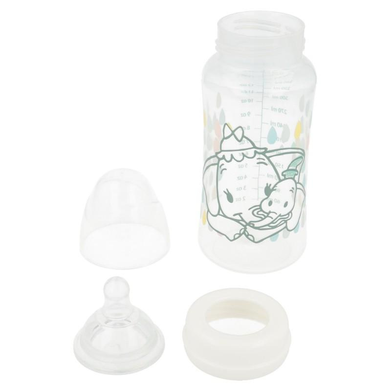 Biberon avec un col élargi et une tétine en silicone à 3 positions, décorée de motifs originaux et attrayants faisant allusion aux personnages d'enfants les plus célèbres.