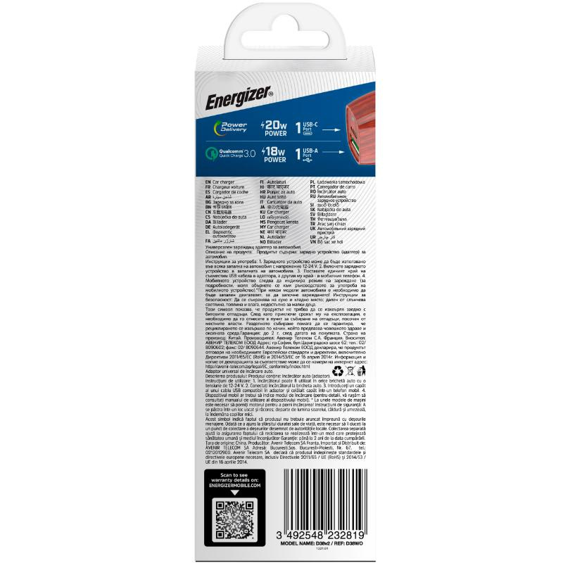 - Le chargeur de voiture Energizer Ultimate dispose de deux ports : 1x USB-C PD 20W et 1 x USB-A QC 18W, ce qui permet de charger deux appareils en même temps.