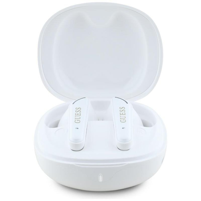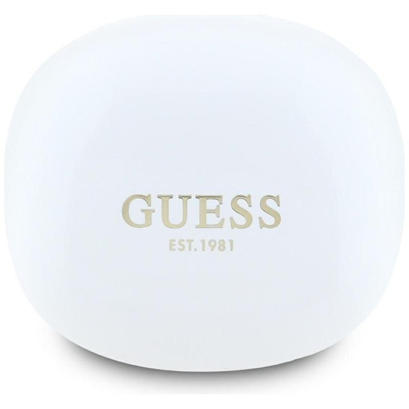 The white color gives them a unique, minimalist character, and the gold Guess brand logo on the casing adds a luxurious touch.