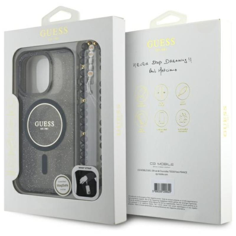 Guess IML Glitter With Pearl Strap MagSafe - Case for iPhone 16 Pro Max (Black)