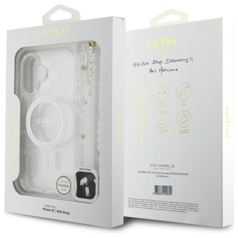 Guess IML Glitter With Pearl Strap MagSafe - Case for iPhone 16 (Transparent)