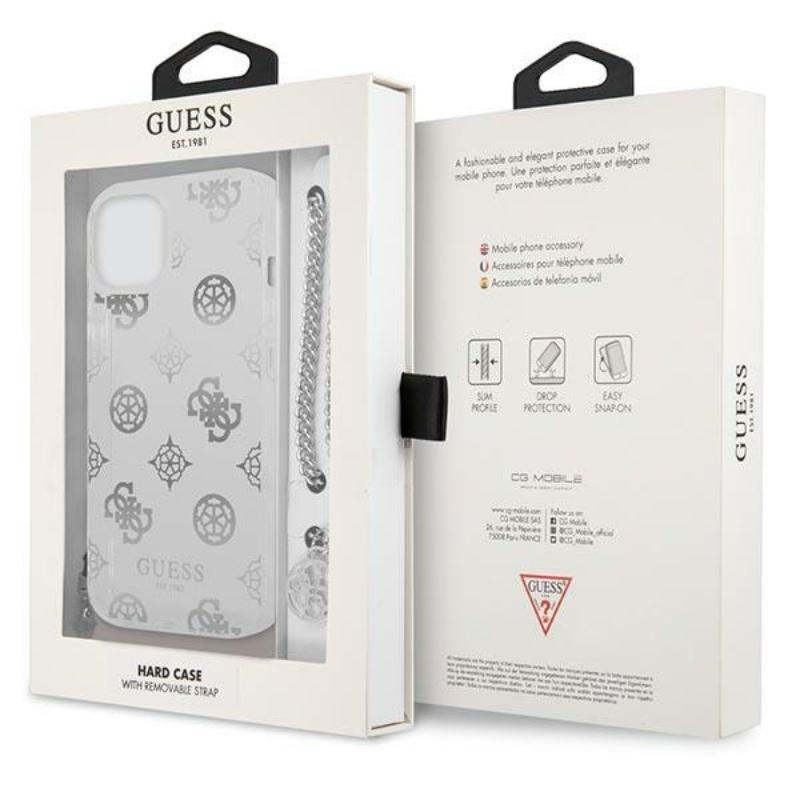 - L'étui Guess Peony Chain Handle est fabriqué en TPU durable, très transparent et fin. Le smartphone repose en toute sécurité dans un design parfaitement conçu qui le recouvre au dos et sur les côtés sans en gâcher l'esthétique de quelque manière que ce so