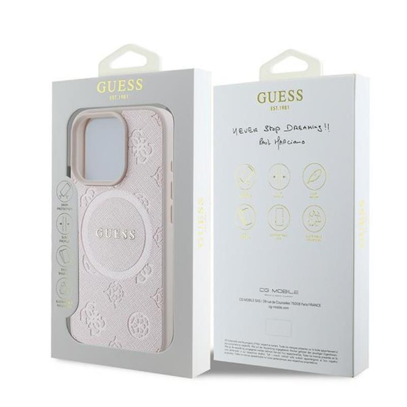 Guess Saffiano Peony Classic Logo MagSafe is a stylish case, designed to effectively protect your device from scratches. Decorated with emblems characteristic of the Guess brand, which are placed on a very pleasant to the touch saffiano texture. The collection is complemented by a golden Guess logo placed in the center. The combination of these elements makes the whole look very elegant. The case protects the back, sides and buttons of the device, providing access to all its functionalities. Slightly raised bezels around the display and camera lens protect against scratches. The case has a magnetic ring inside compatible with MagSafe accessories, guaranteeing easy and fast charging Product Features: · Built-in magnetic ring compatible with MagSafe charger · Pleasant texture saffiano · Gold Guess logo · Protect the back, sides, and buttons of the device · Shock, bump and scratch protection · Perfect fit for your phone · Access to all function keys, jacks, and ports on your phone · Official Guess license *NOTE: MagSafe Charger not included