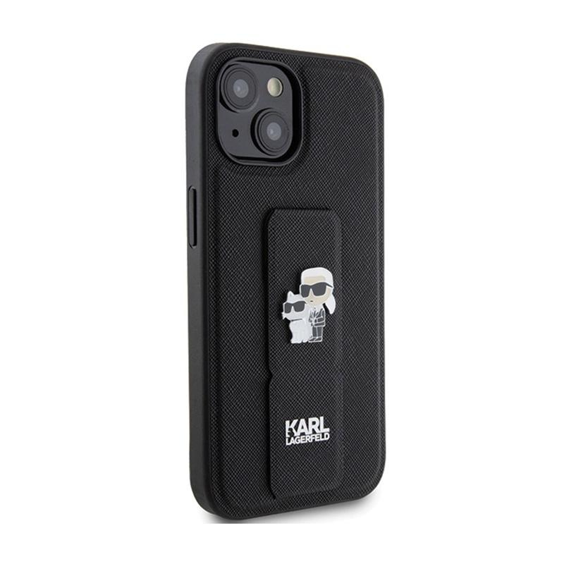 Karl Lagerfeld Gripstand Saffiano Karl & Choupette Pins - iPhone 15 Plus Case (Black)