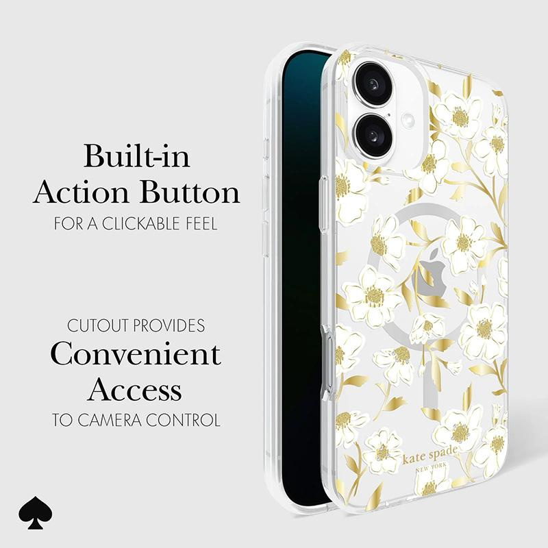 - L'étui MagSafe Protective Gems de Kate Spade New York pour iPhone 16 Plus avec motif Sunshine Floral séduit par son design sophistiqué, alliant style et luxe. De subtils accents dorés et des ornements en cristal ajoutent une touche de glamour
