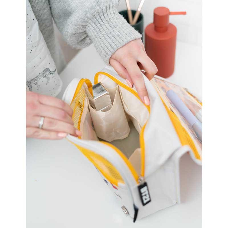 Compartiment principal zippé. Grâce au filet sur le devant, vous pouvez facilement retrouver vos produits cosmétiques.