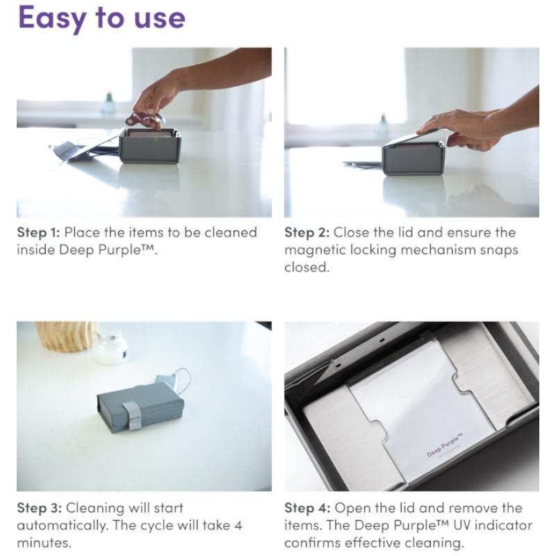 - Deep Purple™ est le premier assainisseur portable au monde équipé de lampes LED UV-C haute performance et de la technologie LumiClear™. Contrairement aux steliris ordinaires de ce type, le Moshi's Deep Purple désinfecte l'ensemble de l'article en une seul