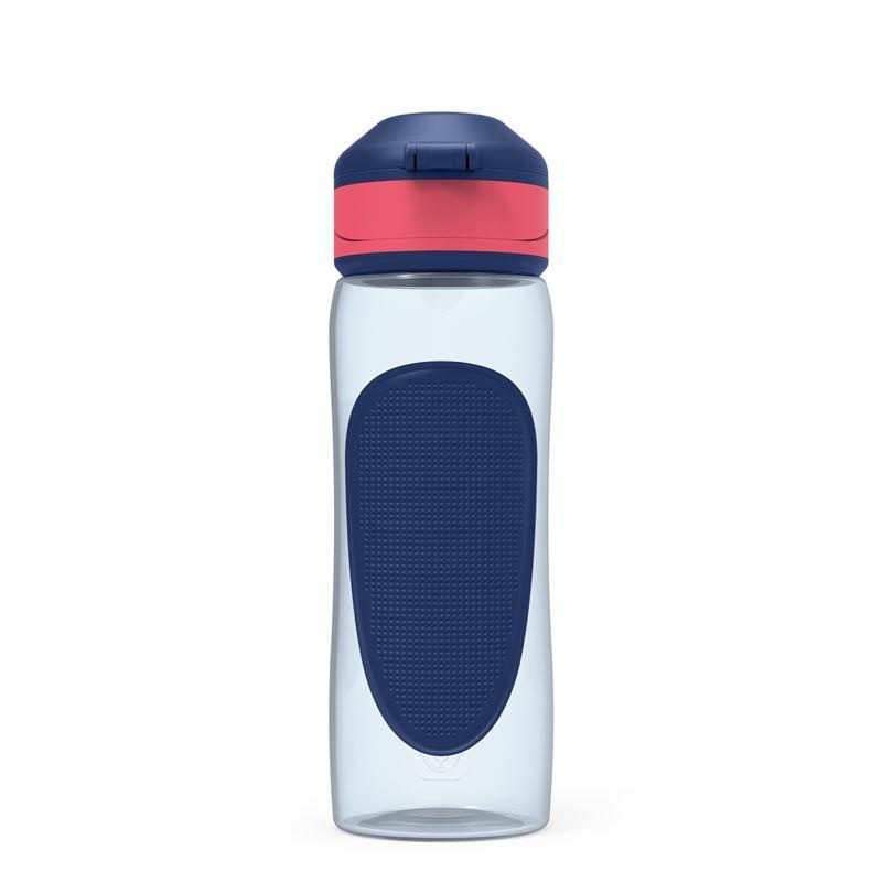 Bouteille avec système d'ouverture rapide. Pressez les éléments du capuchon et le couvercle de l'embout buccal s'ouvre automatiquement. La forme ergonomique et les inserts antidérapants en silicone empêchent la bouteille de glisser.