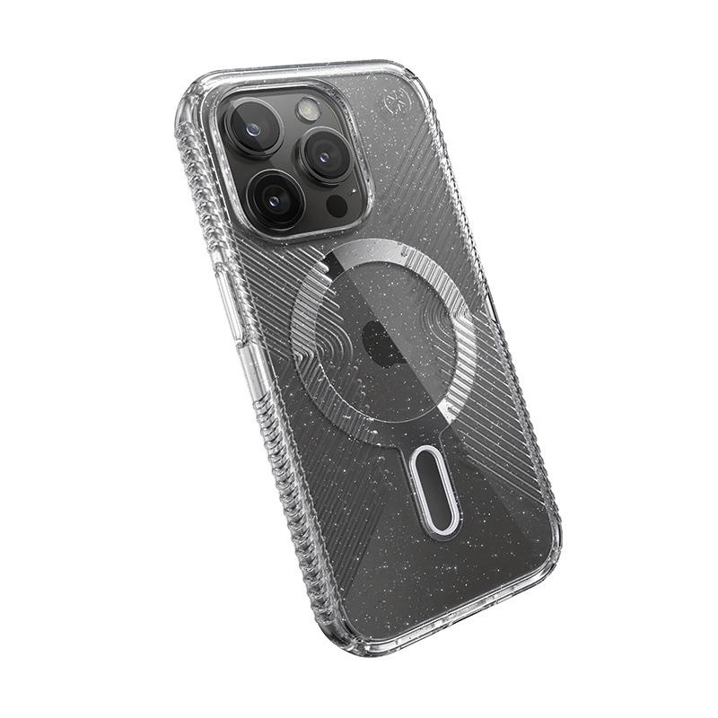 Presidio® Lux Glitter Grip MagSafe® avec la technologie antidérapante ClickLock™ Interlock est un étui transparent avec un aimant intégré, compatible avec les accessoires Apple MagSafe®.