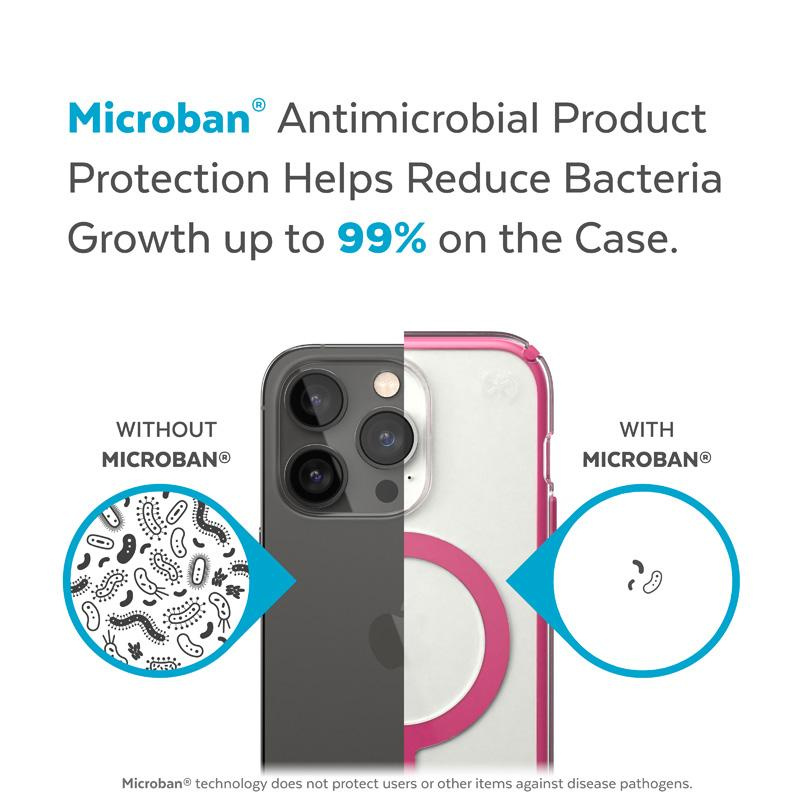L'étui de protection original de Speck offre également une protection antimicrobienne MICROBAN® (un leader mondial en matière de solutions antimicrobiennes avec un large portefeuille de plus de 25 technologies approuvées). L'ingrédient actif intégré dans la structure de l'étui arrête 99 % des bactéries qui s'accumulent à la surface de l'étui. La technologie MICROBAN® offre ainsi une protection à vie contre les bactéries responsables des taches et des odeurs et agit au niveau cellulaire pour maintenir la mallette propre.