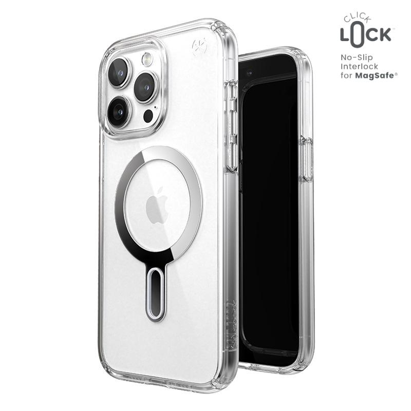 The Speck Presidio® Perfect-Clear MagSafe® with ClickLock™ Interlock anti-slip technology is a transparent case with a built-in magnet, compatible with Apple MagSafe® accessories.