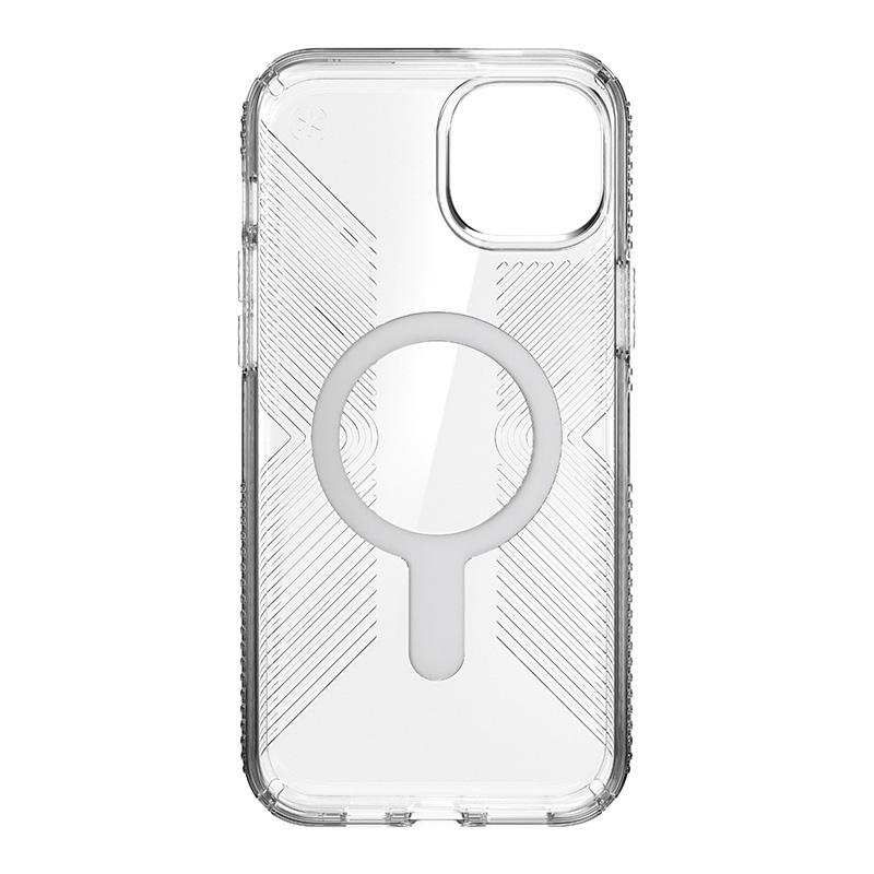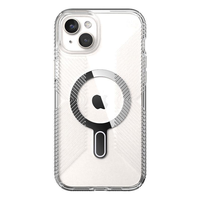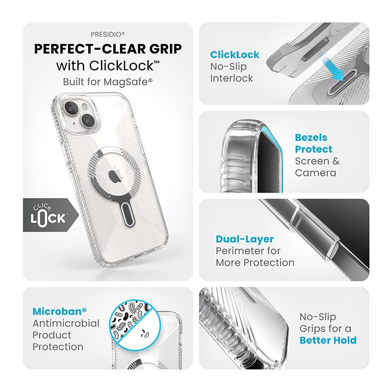 Speck Presidio® Perfect-Clear Grip MagSafe® avec la technologie antidérapante ClickLock™ Interlock est un étui transparent avec aimant intégré, compatible avec les accessoires Apple MagSafe®.