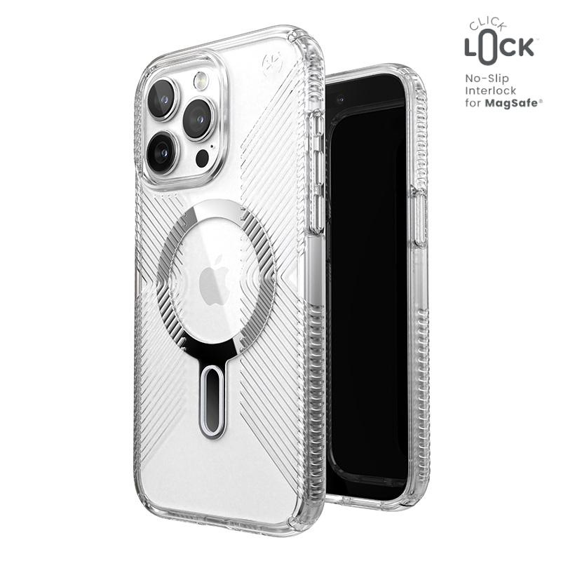 Speck Presidio® Perfect-Clear Grip MagSafe® avec la technologie antidérapante ClickLock™ Interlock est un étui transparent avec aimant intégré, compatible avec les accessoires Apple MagSafe®.
