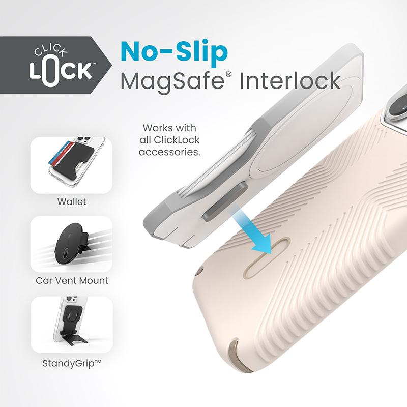 The innovative ClickLock™ Interlock technology creates a non-slip magnetic lock between the Speck MagSafe® case and selected Speck accessories, eliminating accidental falls.