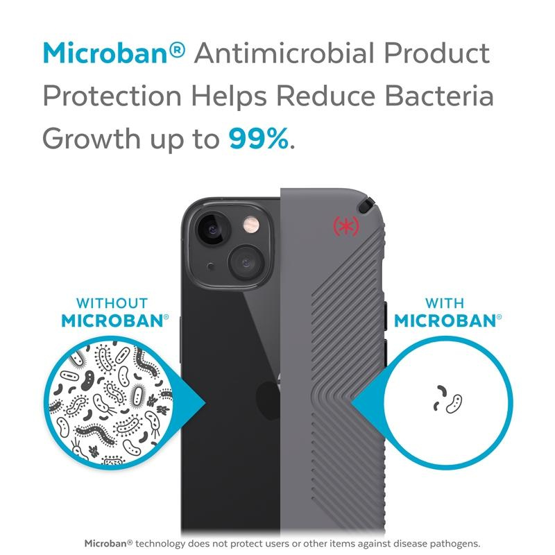 L'étui de protection original Presidio2 Grip de Speck offre également une protection antimicrobienne MICROBAN® (un leader mondial en matière de solutions antimicrobiennes avec un large portefeuille de plus de 25 technologies approuvées). L'ingrédient actif intégré dans la structure de l'étui arrête 99 % des bactéries qui s'accumulent à la surface de l'étui. La technologie MICROBAN® offre ainsi une protection à vie contre les bactéries responsables des taches et des odeurs et agit au niveau cellulaire pour maintenir la mallette propre.