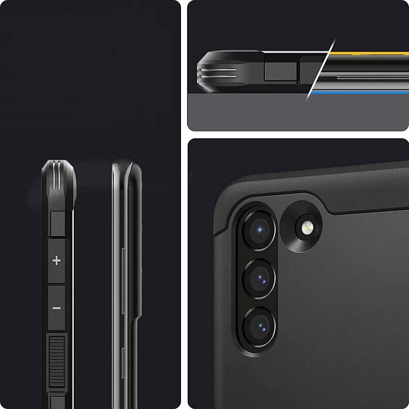 Spigen Tough Armor est un étui hybride doté d'une couche interne en TPU flexible durable et résistant aux chocs, et d'un panneau extérieur en polycarbonate dur et durable. L'intérieur est complété par une fine couche de mousse antichoc. L'étui est facile à mettre en place et ses bords légèrement saillants protègent l'appareil photo et l'écran des rayures sur les surfaces planes.