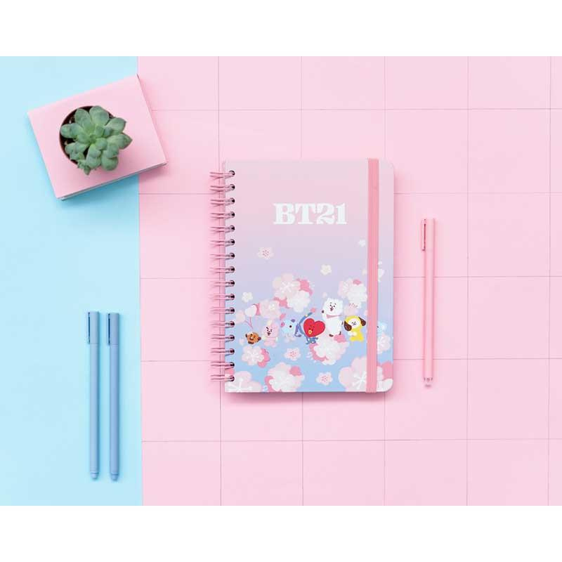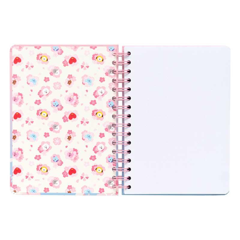 - A5-ös keményfedeles jegyzetfüzet Line Friends BT21 motívummal, személyre szabott belső és külső borítóval, lekerekített sarkokkal, drótkötéssel, rugalmas záródással és belső zsebbel.