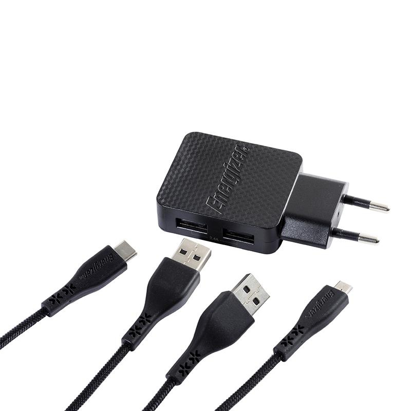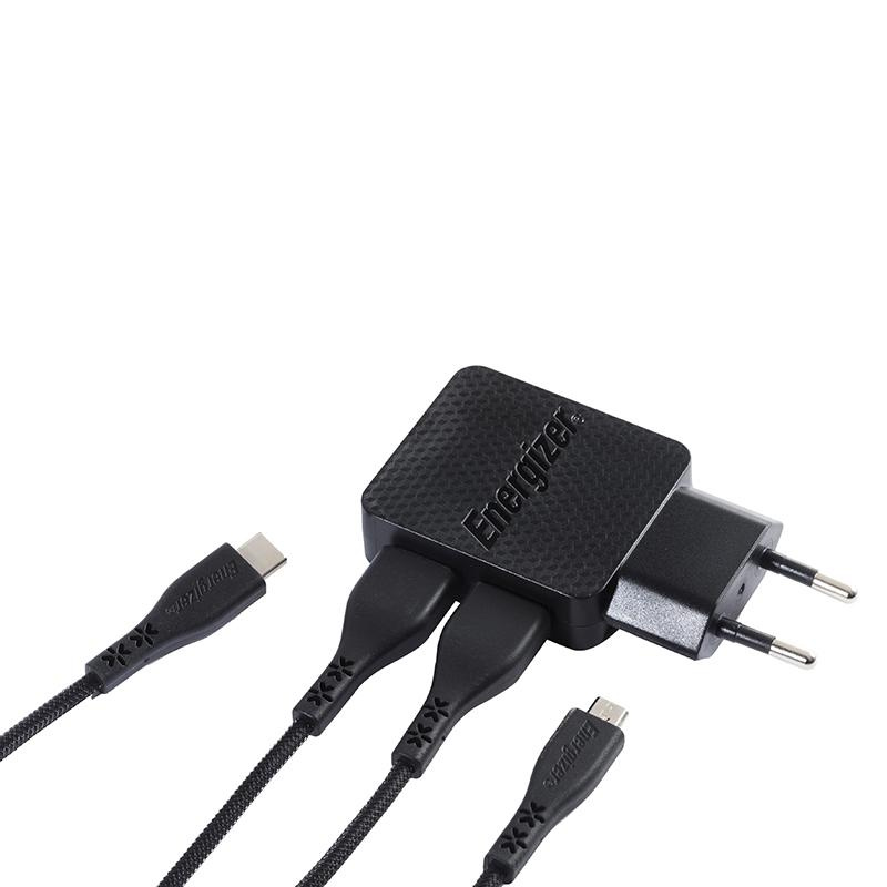 Energizer HardCase - Kompakt hálózati töltő 2x USB-A + USB-C és Micro USB kábel (fekete) élettartam garancia