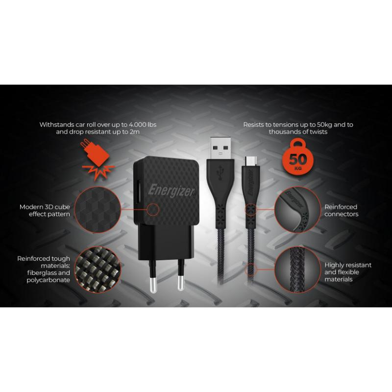 1x USB-C és 1x Micro USB kábelt tartalmaz. Nagyon rugalmas, tartós és ellenáll a csomósodásnak. A rendkívül tartós anyagok felhasználásával tervezett és gyártott Energizer HardCase kábel akár 50 kg-os feszültséget is kibír, így az egyik legerősebb kábel a maga nemében a piacon. A dugók megerősített szerkezete lehetővé teszi, hogy akár 10 000-szer is akadálytalanul hajlíthatók legyenek.