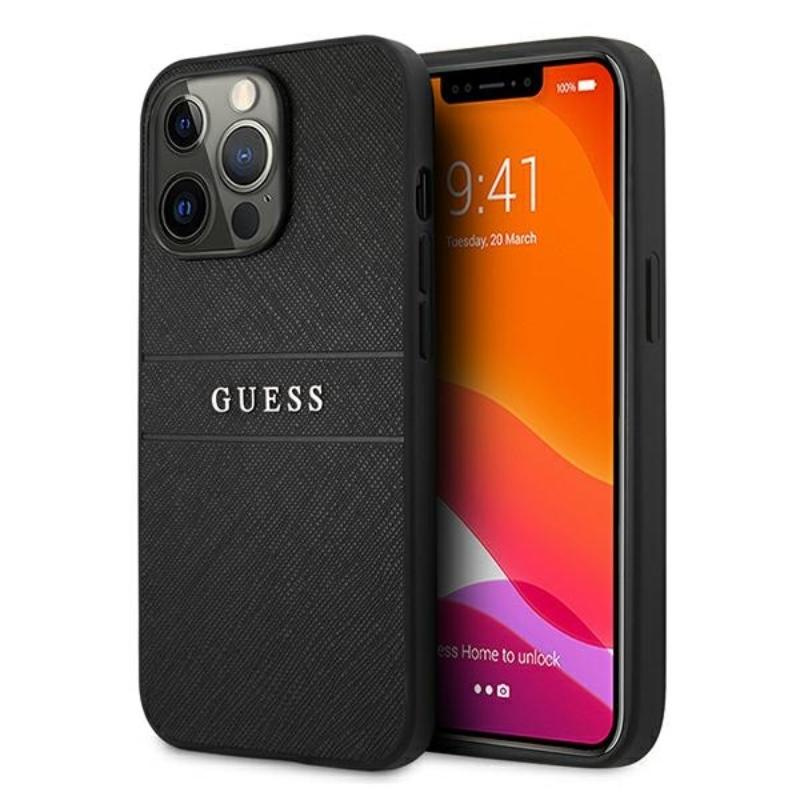 Guess Saffiano fém logós csíkok - iPhone 13 Pro Max tok (fekete)