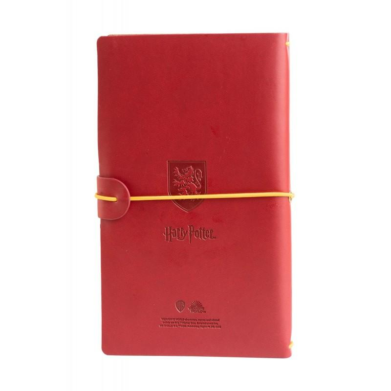 A klasszikus piros borítót a Griffendél ház logója díszíti, amely hiteles hangulatot kölcsönöz neki. A rugalmas szalag nemcsak biztonságos zárást biztosít, hanem további védelmet is nyújt jegyzeteinek utazás közben.