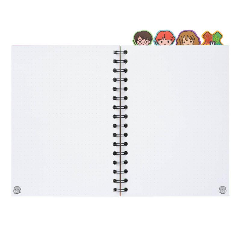 A puha, matt borító, személyre szabott Harry Potter motívummal, stílusos megjelenést kölcsönöz. A jegyzetfüzet masszív, drótkötésű spirálkötéssel rendelkezik, így könnyen fektethető és kényelmes a mindennapi használatra. Ezenkívül négy különleges, dekoratív elválasztót is tartalmaz, amelyek segítenek a jegyzetek rendszerezésében.