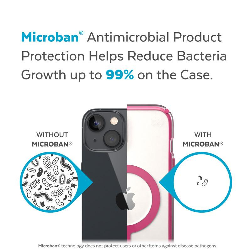 A Speck eredeti védőtokja MICROBAN® antimikrobiális védelmet is kínál (a világ vezető antimikrobiális megoldások terén, több mint 25 jóváhagyott technológiát tartalmazó széles portfólióval). A tok szerkezetébe épített hatóanyag megállítja a tok felületén felhalmozódó baktériumok 99%-át. A MICROBAN® technológia így élethosszig tartó védelmet nyújt a folt- és szagképző baktériumok ellen, és sejtszinten működik a tok tisztán tartása érdekében.