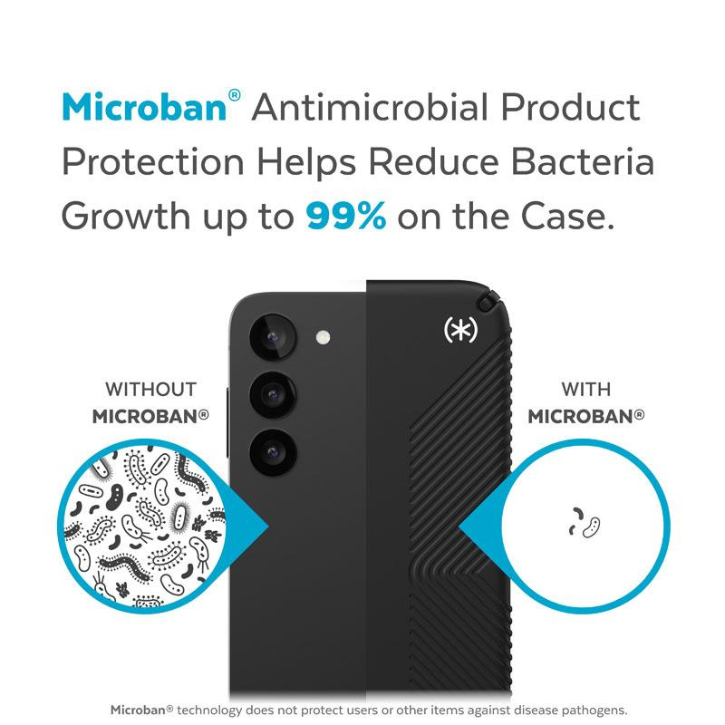 Speck's original Presidio2 Grip protective case also offers MICROBAN® antimicrobial protection (the world leader in antimicrobial solutions with a broad portfolio of over 25 approved technologies). The active ingredient built into the structure of the case stops 99% of the bacteria that accumulate on the surface of the case. MICROBAN® technology thus provides lifelong protection against stain- and odour-causing bacteria and works at the cellular level to keep the case clean.