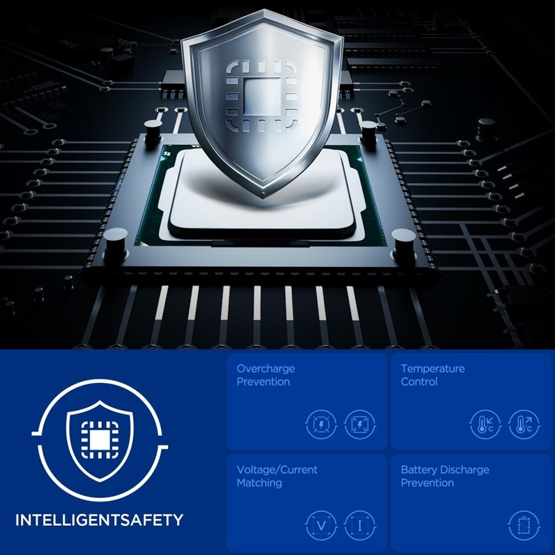 Egy 15 fokozatú biztonsági rendszer véd a túltöltés, a túlmelegedés és a túlfeszültség ellen. A Quantum Boost technológia intelligensen felismeri a csatlakoztatott eszközöket, és automatikusan kiválasztja a leghatékonyabb töltési paramétereket.