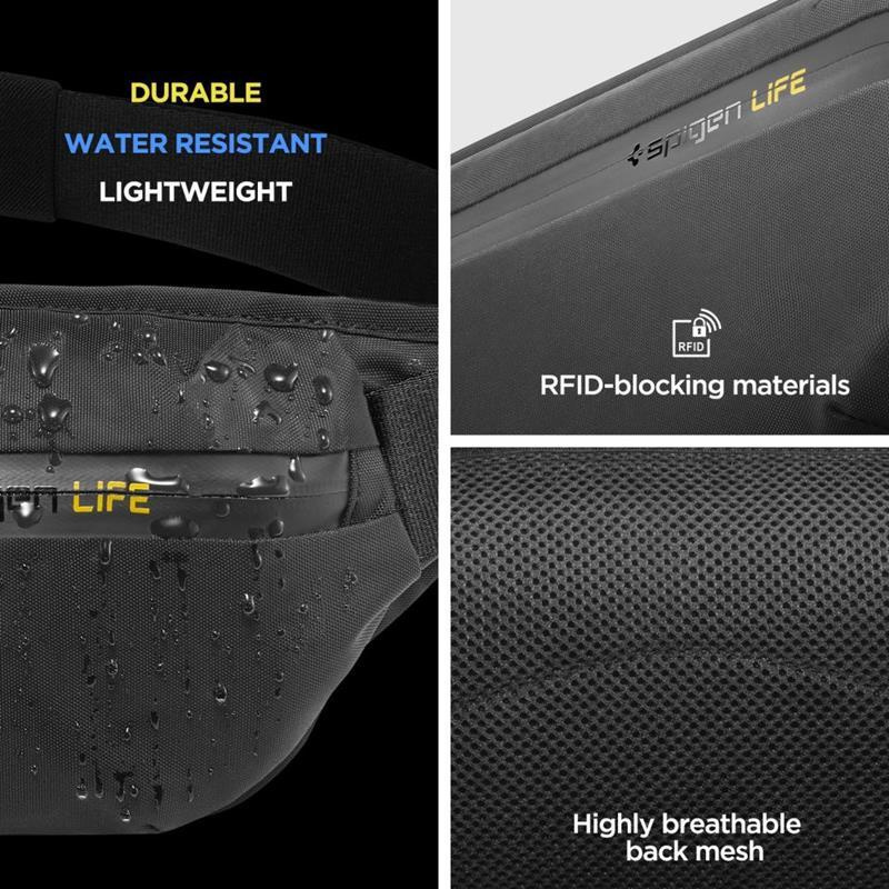 - A Spigen KD411 Waist Bag Klasden egy funkcionális tasak, amelyet könnyű és tartós nejlonból készítettek, ideális a mindennapi használatra. A táska hátulján lévő hálós betétnek köszönhetően javul a levegő keringése, így kényelmes viseletet biztosít. Sasz
