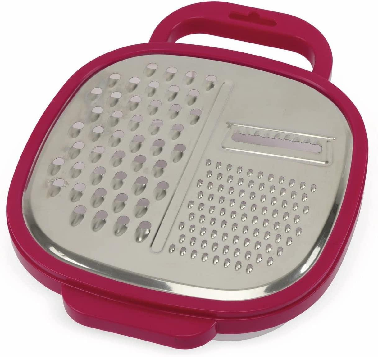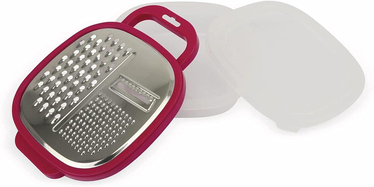Uniwersalna tarka z trzema rodzajami noży i tacką na odpady w kolorze różowym. Dodatkowa pokrywa chroni tarkę podczas przechowywania.