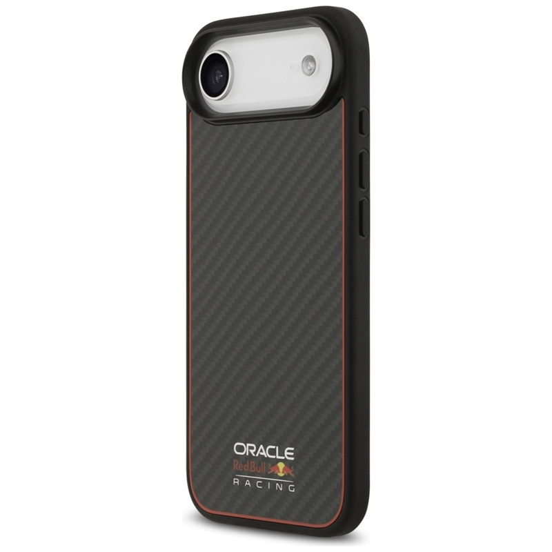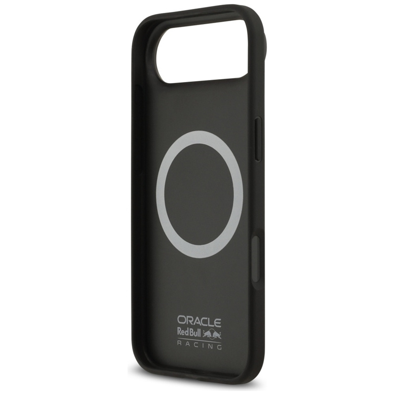 Lo stile dinamico della custodia è enfatizzato dalla caratteristica linea rossa che corre lungo i bordi, così come dalla cornice della fotocamera e dai pulsanti neri, che creano una composizione coerente ed espressiva. L'iconico logo Oracle Red Bull Racing completa il look, confermando l'autenticità del prodotto e la massima qualità di lavorazione.