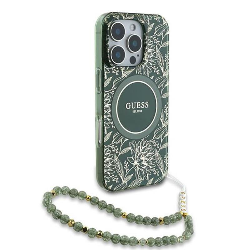 Guess IML Flowers Allover Electro With Pearl Strap MagSafe - Case for iPhone 16 Pro (Green)