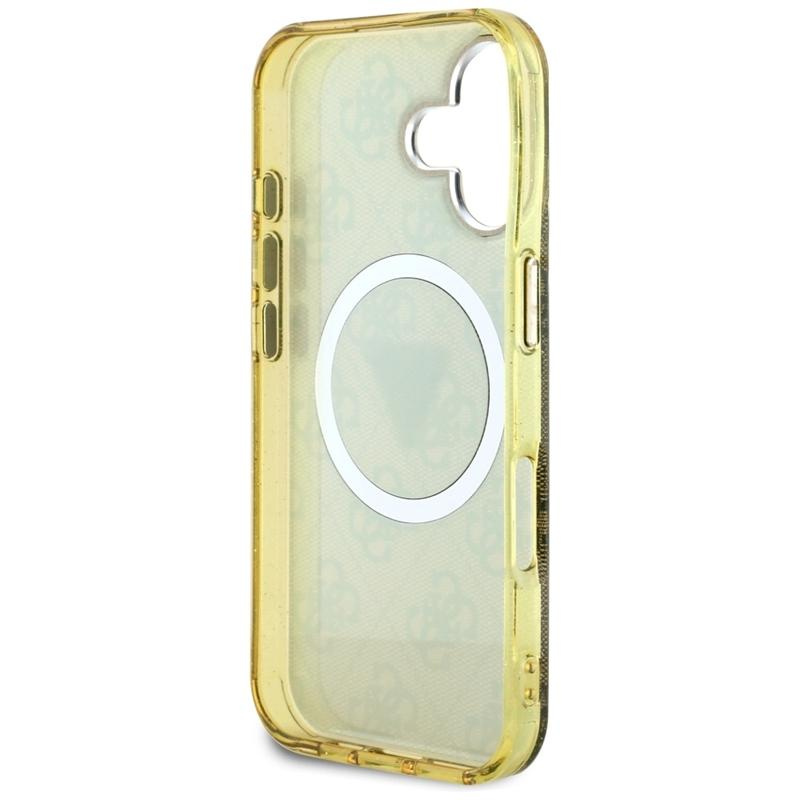 The glitter surface is decorated with a characteristic 4G pattern and a gold MagSafe ring, perfectly emphasizing the triangular Guess logo.