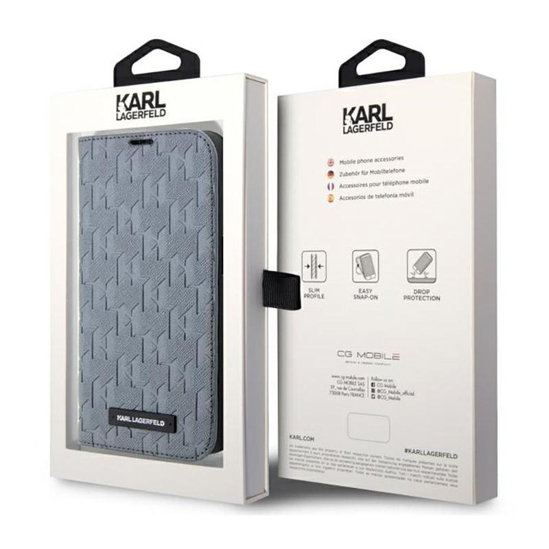 The Karl Lagerfeld Booktype Saffiano Monogram is a case constructed from tactile Saffiano eco leather with an embossed monogram. A metal plate with the Karl Lagerfeld logo completes the look.