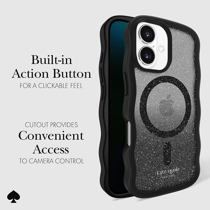 - Etui Kate Spade New York Wavy MagSafe do iPhone 16 to stylowe połączenie funkcjonalności i modnego designu. Jego unikalny falisty wzór, pokryty eleganckim czarnym brokatowym ombre, nadaje Twojemu telefonowi wyjątkowy wygląd, który doskonale sprawdzi się p