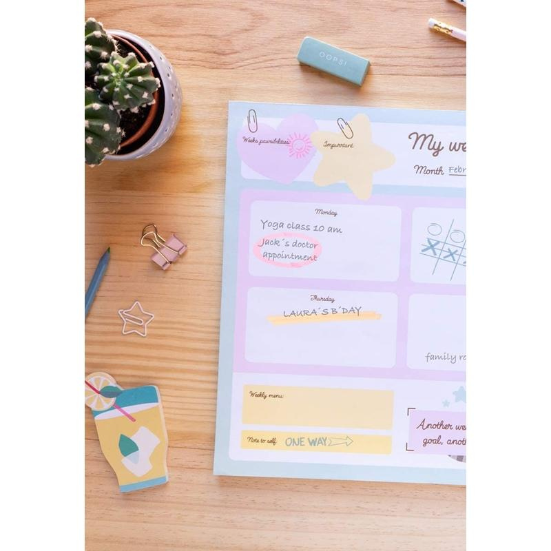 Posiada wiele miejsca na notatki, na każdy dzień tygodnia. Duży rozmiar A3 i 54 kartki umożliwia na zapisanie i organizowanie najważniejszych wydarzeń, przypomnień czy listy zakupów.