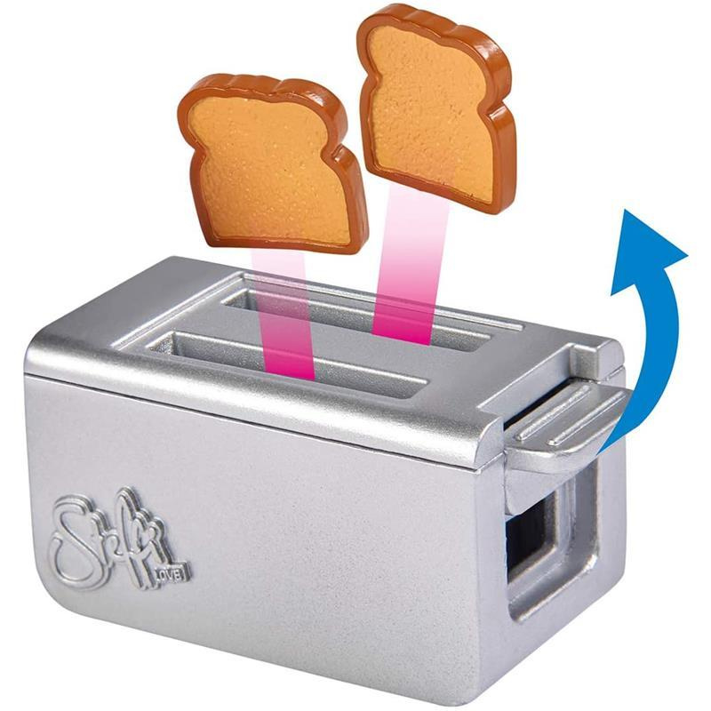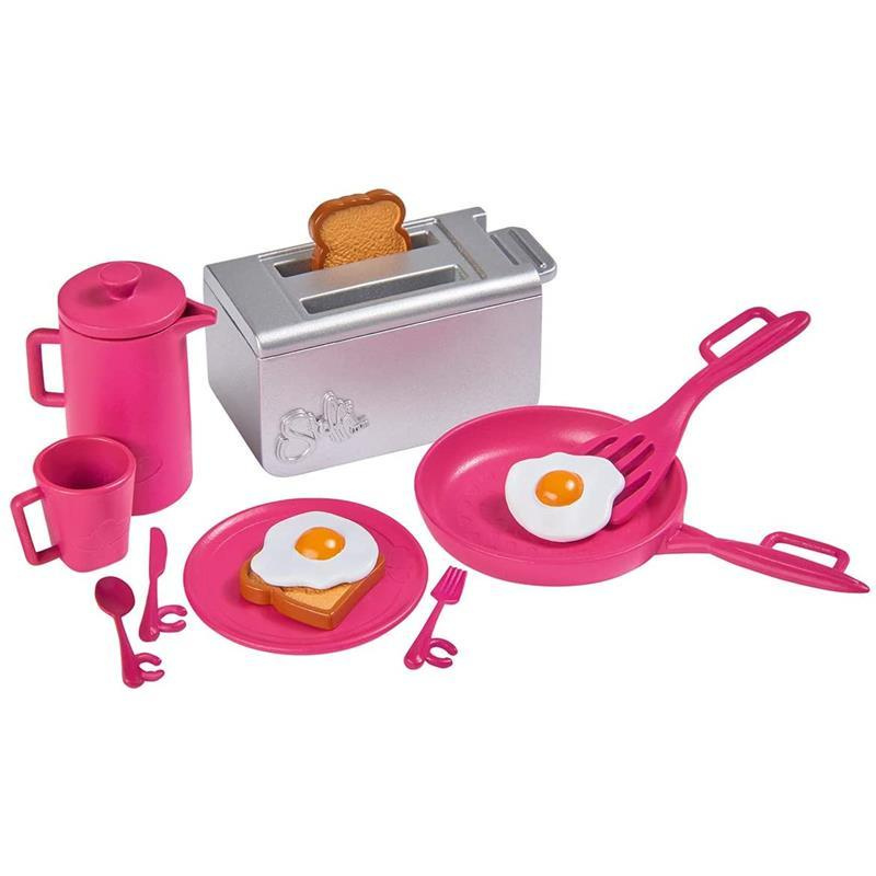 · Zestaw zawiera: lalkę, toster z funkcją wyskakiwania tostów, patelnia, tosty, jajka sadzone, talerz, sztućce, szpatułka. kubek i dzbanek,