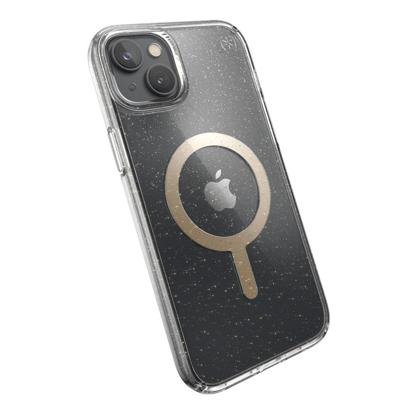 Speck Presidio Perfect-Clear con glitter + MagSafe - Custodia per iPhone 15 Plus / 14 Plus con rivestimento MICROBAN (trasparente / glitter oro)