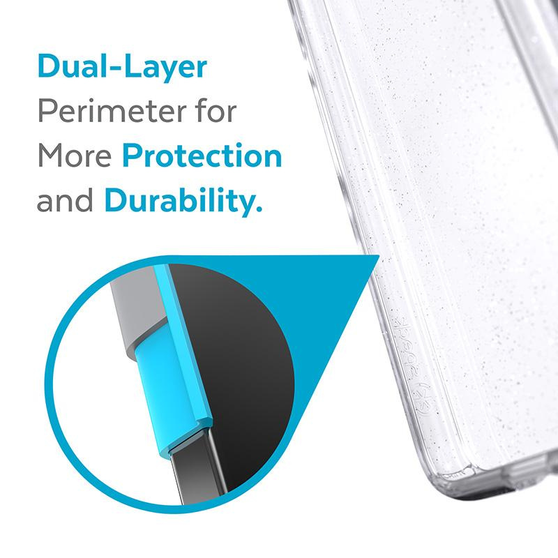 Presidio® Perfect Clear with Glitter to przezroczysta konstrukcja, odsłaniająca wszystkie walory estetyczne telefonu, jednocześnie wykorzystująca najnowszą technologię IMPACTIUM™ Shock Barrier, która chroni telefon przed uszkodzeniami podczas upadku. To wszystko dzięki dwóm warstwom: zewnętrznej, która rozprasza siłę uderzenia oraz wewnętrznej IMPACTIUM™, absorbującej wstrząs. W ten sposób etui skutecznie zabezpiecza telefon i chroni go przed uszkodzeniem. Według przeprowadzonych testów etui wytrzymuje upadek z wysokości prawie 4 m. Ponadto, Speck opatentował w swoich etui system ochrony wyświetlacza, który minimalizuje ryzyko uszkodzenia telefonu podczas upadku ekranem do dołu. Wszystkie produkty Speck są testowane pod kątem odporności na zarysowania, odporność chemiczną oraz precyzyjnego dopasowania, w celu dostarczenia wysokiej jakości etui.
