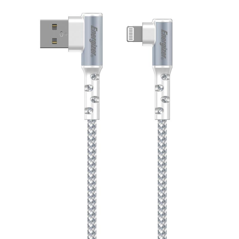 - Kabel Energizer Ultimate do ładowania i transmisji danych o długości 200 cm, wyposażony w złącze USB-A na Lightning 90° i posiadający certyfikat Apple MFi. Kabel ma kształt litery L, dzięki czemu można go łatwo podłączać i odłączać.