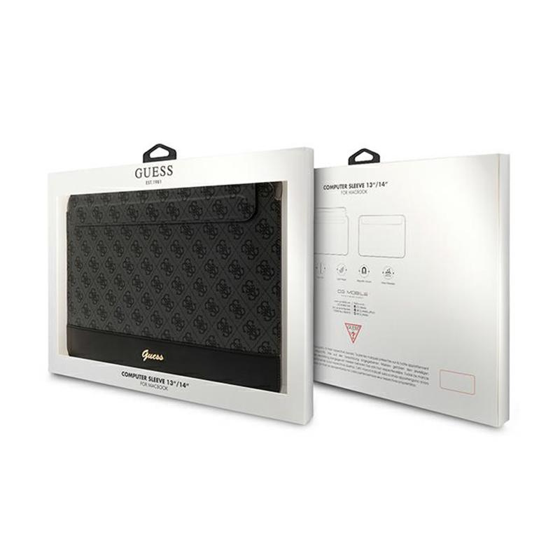 Guess 4G Stripe Metal Logo case for a 14-inch notebook. The product features one of the more famous motifs used by Guess, the 4G emblems, which are positioned on a pleasant-to-touch texture in Saffiano eco leather.