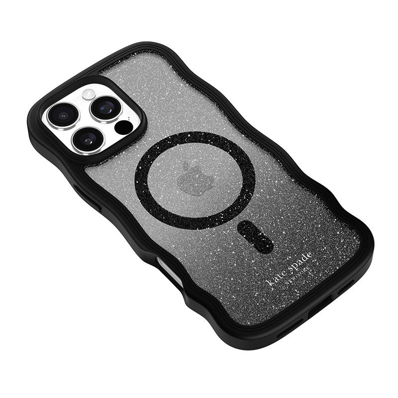 - Etui Kate Spade New York Wavy MagSafe do iPhone 16 Pro Max to stylowe połączenie funkcjonalności i modnego designu. Jego unikalny falisty wzór, pokryty eleganckim czarnym brokatowym ombre, nadaje Twojemu telefonowi wyjątkowy wygląd, który doskonale sprawd