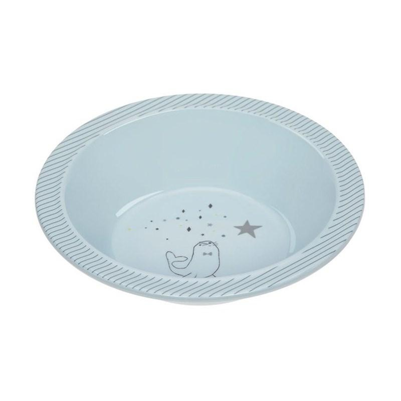 - Okrągła miseczka z melaminy w bardzo jasnym kolorze niebieskim ma szerszy brzeg w drobne paseczki, a na dnie – motyw radosnej foki w muszce na cyrkowym podeście oraz gwiezdnego pyłu w kolorach ciemnoniebieskim, czarnym, szarym i żółtym. Miseczka jest lekk