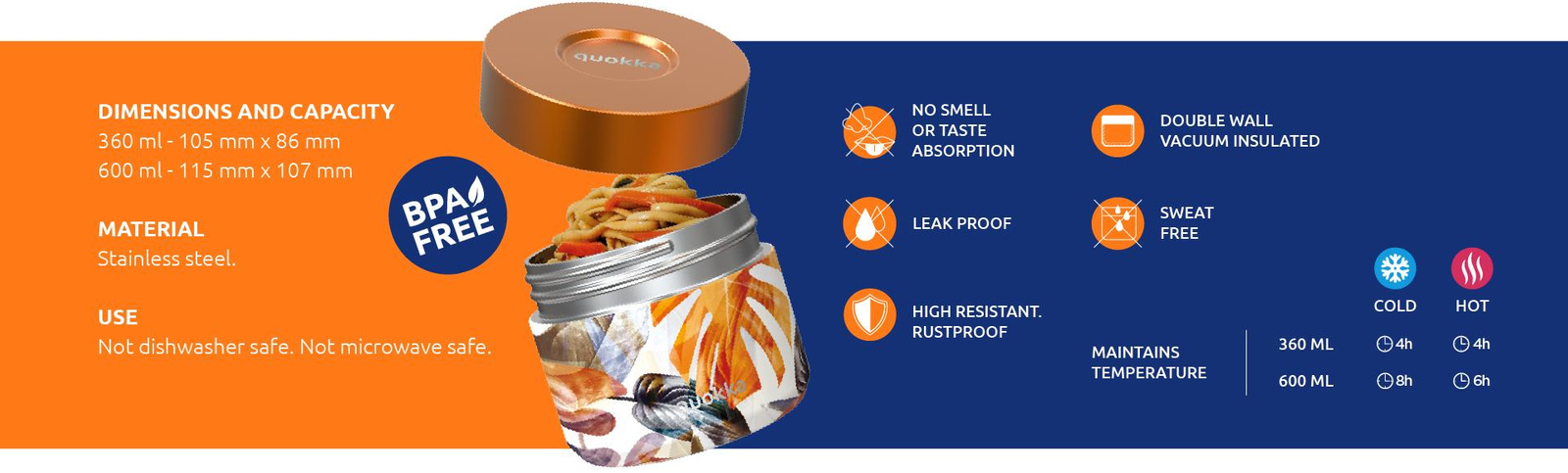 The lightweight and handy stainless steel thermos design is strong enough to take anywhere without worrying about flavor or odor transferring to your meal.