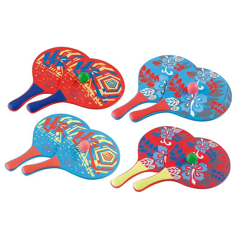 - Zestaw składający się z 2 kolorowych rakietek plażowych i piłki.