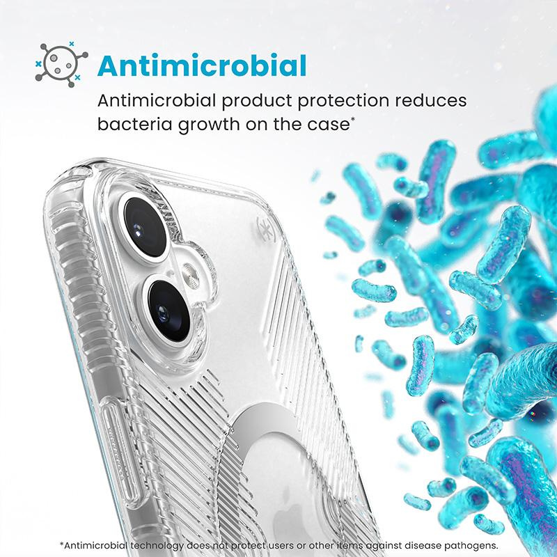 The Speck Presidio® Perfect-Clear Grip MagSafe® with ClickLock™ Interlock anti-slip technology is a clear case with a built-in magnet, compatible with Apple MagSafe® accessories.